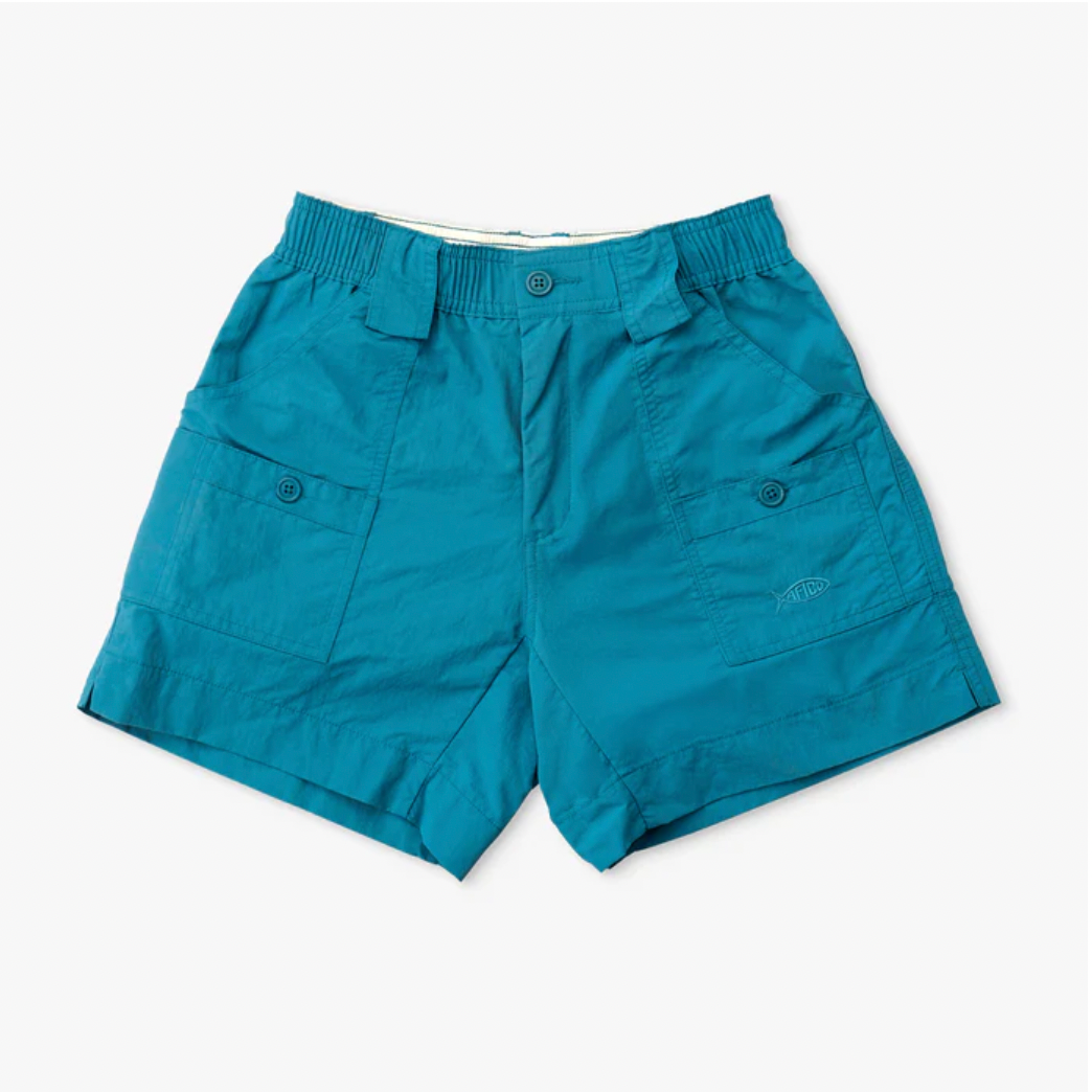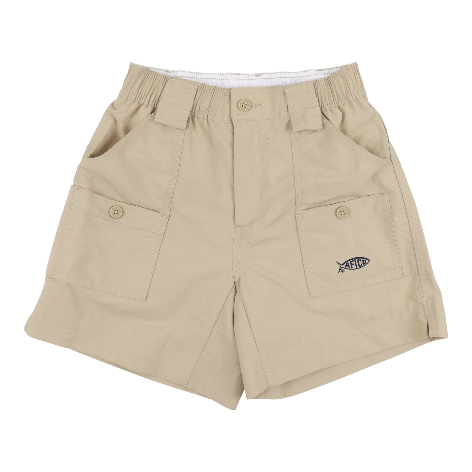 The "Original" AFTCO short, is now offered in kids sizing! Introduced in 1989 the "Original" AFTCO fishing short has been the choice of serious fishermen nation-wide. These AFTCO shorts for kids are constructed of Dupont Supplex 3-ply nylon and has been treated with a stain resistant coating. It is a extremely strong and supple fabric that is also lightweight and super comfortable day in and day out. Included these shorts have 7 pockets (including a cordura-lined pliers pocket) so you will have a place for everything. It also has a double layered rear for extra strength. 27 bar tacks keep these fishing shorts strong in all the right places. AFTCO embroidery on the left pocket. Elastic waist + belt loops. AFTCO kids shorts are built to handle all they can throw at them.