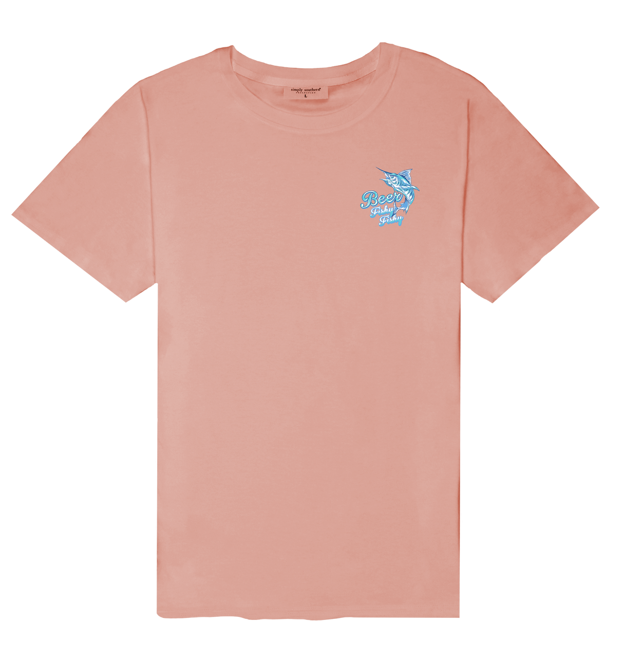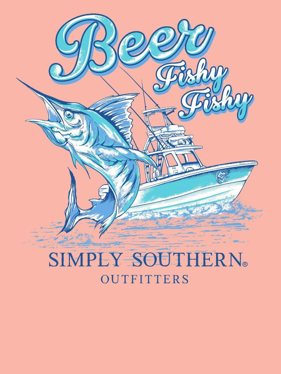 Cocktail orange short sleeve shirt with the phrase 'Beer fishy fishy' and a marlin jumping from the water with a boat in the background. Simply Southern logo below. Similar design on left chest. 100% cotton. Unisex sizing.